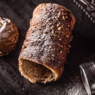 Divide the dough into four equal strips and place them on a floured surface. For each portion, use three strips weighing 62.5 grams each. Sprinkle 1/3 of the topping mixture over them and roll them into a spiral, overlapping each strip, around a metal rolling pin (4 cm in diameter). Use a brush to coat them with sugar syrup and secure them well. Once formed into a spindle, brush the top with sugar syrup, sprinkle with the remaining sugar-cinnamon mixture, and add crushed nuts.