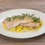 Place the fish fillet and potatoes on a plate, drizzle the potatoes with 1 teaspoon of olive oil and sprinkle with parmesan, garnish the fish with dill and serve.