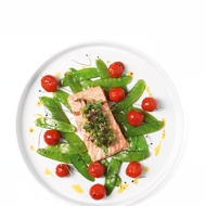 Remove the salt crust from the fish along with the skin, and cut it into portions. Place each piece on a bed of sautéed green pea pods and cherry tomatoes. Top with salsa.