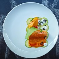 For serving, arrange zucchini slices as a 'mat', top with carrot puree, place the trout beside it, and drizzle with the carrot puree sauce. Finish the dish by dotting with the sour cream and Tom Yum cream.