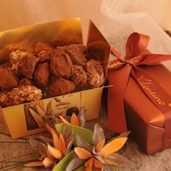Combine with the butter, melting it in the liquid, but do not boil. Add the vanillin, nuts, and raisins. Mix with the cocoa powder until fully dissolved.