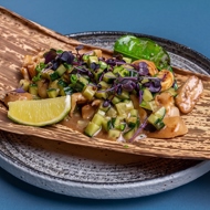 Spread the resulting mixture onto a palm leaf, and sprinkle with chopped cilantro and sesame seeds.