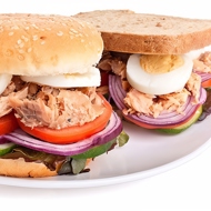 On 4 halves of the buns, place some salad leaves, a bit of onion, a piece of tuna, and drizzle with mayonnaise. Season with salt and pepper. Top with the other halves of the buns.