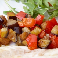 Squeeze the eggplants, dry them with a paper towel, and transfer them to a bowl. Add a tablespoon of olive oil and mix well. Spread the pieces on a baking sheet measuring 30 by 40 cm, placing the eggplants below and the tomatoes above. Bake for 25 minutes. Let the tomatoes cool and cut them into small pieces.