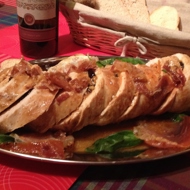 Remove the roll, take off the bacon, remove the twine, slice the roll at an angle, and garnish with herbs and the same bacon.