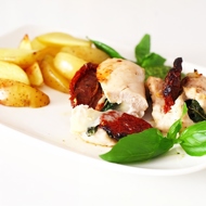 Serve the roll-ups with pesto sauce and potatoes, garnished with remaining basil leaves.