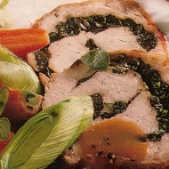 Roll it up, tucking in the edges. Wrap with two strips of bacon. Secure with kitchen twine.
