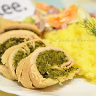 Place the prepared roll in a baking dish. Pour a little water (about 1–2 cm) into the bottom and bake in the oven for 60–80 minutes at 392°F.
