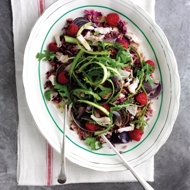 To make the dressing, add the red currant jelly, vinegar, mustard, zest, and juice of one lemon to a small pot. Season with salt and pepper and whisk over low heat until the dressing is smooth and the jelly has melted. Allow it to cool, and then you can dress the salad.