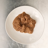 Meanwhile, roast the boiled turkey in the oven for 20 minutes at 482°F. Remove it, let it cool, and cut it into portion-sized pieces—not too large, but not too small, similar to those used in a stew.