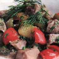 Pour in the wine and simmer for 5 minutes. Then add the mushrooms, thyme, broccoli, season with salt, and pour in the cream. Cover and simmer for 20-30 minutes.