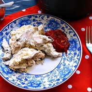 Layer the meat and the cottage cheese mixture in the bowl of a multicooker, alternating them so that the top layer is turkey.