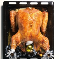Place the stuffed turkey in the oven for fifteen minutes, then take it out again and drizzle it with a mixture of olive oil, balsamic vinegar, and cognac. Put it back in the oven for another thirty minutes (the time may vary depending on the oven's power and the size of the turkey, which can weigh up to 12 kg). After that, check if the meat is cooked: the juices from the incision should be clear, without any blood or discoloration. If everything is fine, remove the turkey from the oven and serve it with chestnuts from the cavity and green salads.