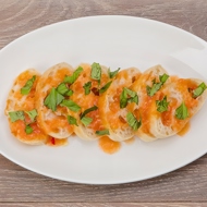 On a plate, layer the bread and drizzle it with the tomato sauce, sprinkle with basil.