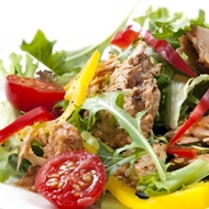 Cut the salad leaves into strips. Place in a bowl and toss with the remaining dressing. Serve on plates and top with a small amount of the tuna salad. Garnish with red pepper and olives.
