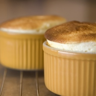 Divide the mixture evenly among 6 ramekins and place them in a baking dish. Fill the dish with boiling water up to 1 cm and place in the oven. Bake for 20 minutes. Let cool. Once the soufflés are completely cool, remove them from the ramekins and place them on a greased shallow baking tray, loosely covering with plastic wrap.