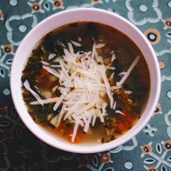 Add coarsely chopped spinach without stems, canned beans, peas, and sliced frisée leaves. Cook, stirring, for ten minutes. Season with salt and pepper, add basil, and divide into bowls. Sprinkle with cheese and drizzle with olive oil.