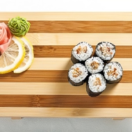 Cut the roll into 6–8 equal pieces and serve with soy sauce, pickled ginger, wasabi, and lemon.