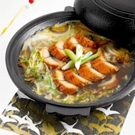 Slice green onions and shiitake mushrooms into thick strips, place them in a cold small frying pan, then arrange the sliced eel on top. Pour sauce over everything, bring to a boil, turn off the heat, and immediately pour in the egg mixed with salad.