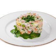 An unusual Olivier salad featuring Grandos turkey sausage.