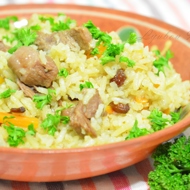 Rinse the rice well and soak it in cold water for 1 hour. Peel the onion and carrots, finely chop the onion, and cut the carrots into sticks. Wash the meat and cut it into cubes. Rinse the raisins and dried apricots.