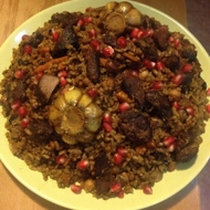 After the rice has absorbed all the liquid and all the aromas, serve it. For this, you need to remove all the meat from the cauldron, and mix the rice with the rest of the contents of the cauldron. Cut the pieces of lamb into smaller pieces. Serve the rice on a large plate or simply on a large dish, placing the meat and heads of garlic on top.