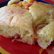 Place the sliced fruits on a baking sheet and pour the batter over them, then sprinkle with cinnamon on top.