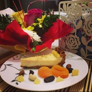 The center of the finished cheesecake (after baking) should slightly jiggle when the pan is moved. After cooling, the cheesecake will 'finish cooking' and the center will become firm.