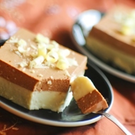 When the dessert is fully set, it can be cut into portioned pieces and garnished with fruits or chocolate.