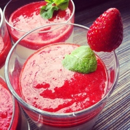 For the sauce, first thaw the strawberries. Blend them in a blender along with the juice and water that were released during thawing. Add powdered sugar to taste. (I add a little, about 3–4 teaspoons, to keep the sauce tangy). In a small cup, dissolve 1–2 teaspoons of cornstarch or flour in boiling water, mix well, let it sit for a couple of minutes, and then add it to the sauce. Mix everything together. Drizzle the resulting mixture over the panna cotta after it has set.
