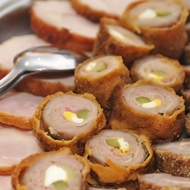 Tenderize the veal pieces well, sprinkle with pepper, salt, and drizzle with lemon juice. Place a slice of ham and half of a hard-boiled egg on each cutlet. Roll them up and tie with string.