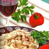 Add the meat broth, bring to a boil, and remove from heat. Whip the cream with the yolk, pour it into the pan with the kidneys, season with salt and pepper to taste. Add the brandy, stir, and sprinkle with parsley.
