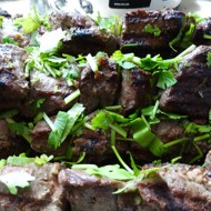 Cut fresh veal liver into cubes about 3 cm by 3 cm, mix with minced garlic, soy sauce, cognac, and vegetable oil, and let marinate for half an hour, no longer.