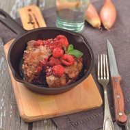 Add the raspberries, without their stems (reserve a few berries for garnish), to the skillet and simmer over medium heat for another 4–5 minutes. Then, add the wine vinegar and butter, and stir to combine. If the sauce tastes too tart, add a little sugar.