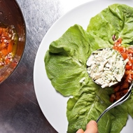 On a large plate, arrange four lettuce leaves in a cross pattern, tearing off the part at the base of each leaf that resembles a crumpled accordion, so that the leaves lay flat against the plate.
