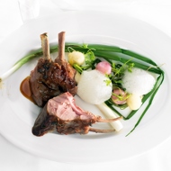 Place two pieces of veal rack on a baking sheet, drizzle with olive oil, add two sprigs of thyme and two cloves of garlic. Keep in an oven preheated to 149°F for four hours, basting the meat with the oil from the pan occasionally (alternatively, you can simply grill the meat, or cook it at the same temperature in a vacuum for one and a half hours).