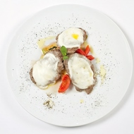 Place the sautéed tomatoes and zucchini on a plate, then top them with slices of veal and mozzarella. Finally, season the dish with freshly ground black pepper, garnish with a mint leaf, and drizzle with a teaspoon of olive oil.