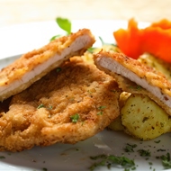 Meanwhile, pound the meat well to a thickness of 5 mm. Dredge in flour mixed with spices and shake off the excess. Dip the meat in lightly beaten eggs, then coat in breadcrumbs. Place the meat in a container and put it in the freezer for 5 minutes.
