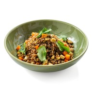 Serve the buckwheat with sweet potato and eggplant, sprinkled with za'atar and garnished with cilantro sprigs.