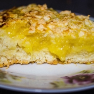 Spread the filling in the baking dish so that it does not go over the edges, and grate the frozen dough on top using a coarse grater.
