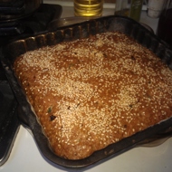 Grease a baking pan and dust it with flour (fill the pan with the prepared mixture halfway). Before baking, sprinkle with sesame seeds and bake at 180–374°F for 40 minutes.