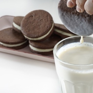 In a large bowl, combine the flour, cocoa powder, baking soda, salt, and 70 grams of powdered sugar.