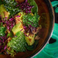 Arrange the frisée and spinach leaves, sautéed avocado, quinoa, pickled ginger, and sun-dried tomatoes on a plate.