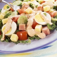 Dress with mayonnaise, mix well, and garnish with finely chopped herbs.