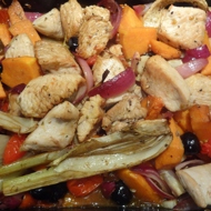 Then add the turkey with garlic and olives, drizzle with the juices from the roasted vegetables, and bake for another 6–8 minutes until the turkey is cooked through.