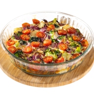 Cut the cherry tomatoes in half and place them on the vegetables cut side up. Put the dish in the oven preheated to 392°F for 25–30 minutes.