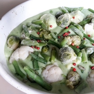 Top with Brussels sprouts and green beans in a random order.
