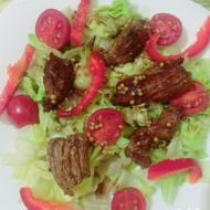 Arrange the salad on a flat plate. Top the vegetables with pieces of beef.