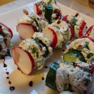 Then stuff a cucumber round with the cottage cheese mixture and stick a radish round on top; repeat the process — cottage cheese, cucumber, cottage cheese, radish.