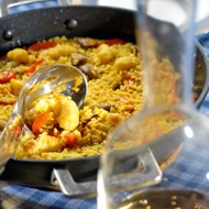 Then add the rice. Bring to a boil, reduce the heat slightly, and let the paella cook until the rice has absorbed all the broth, without stirring. Season with salt to taste and serve immediately.